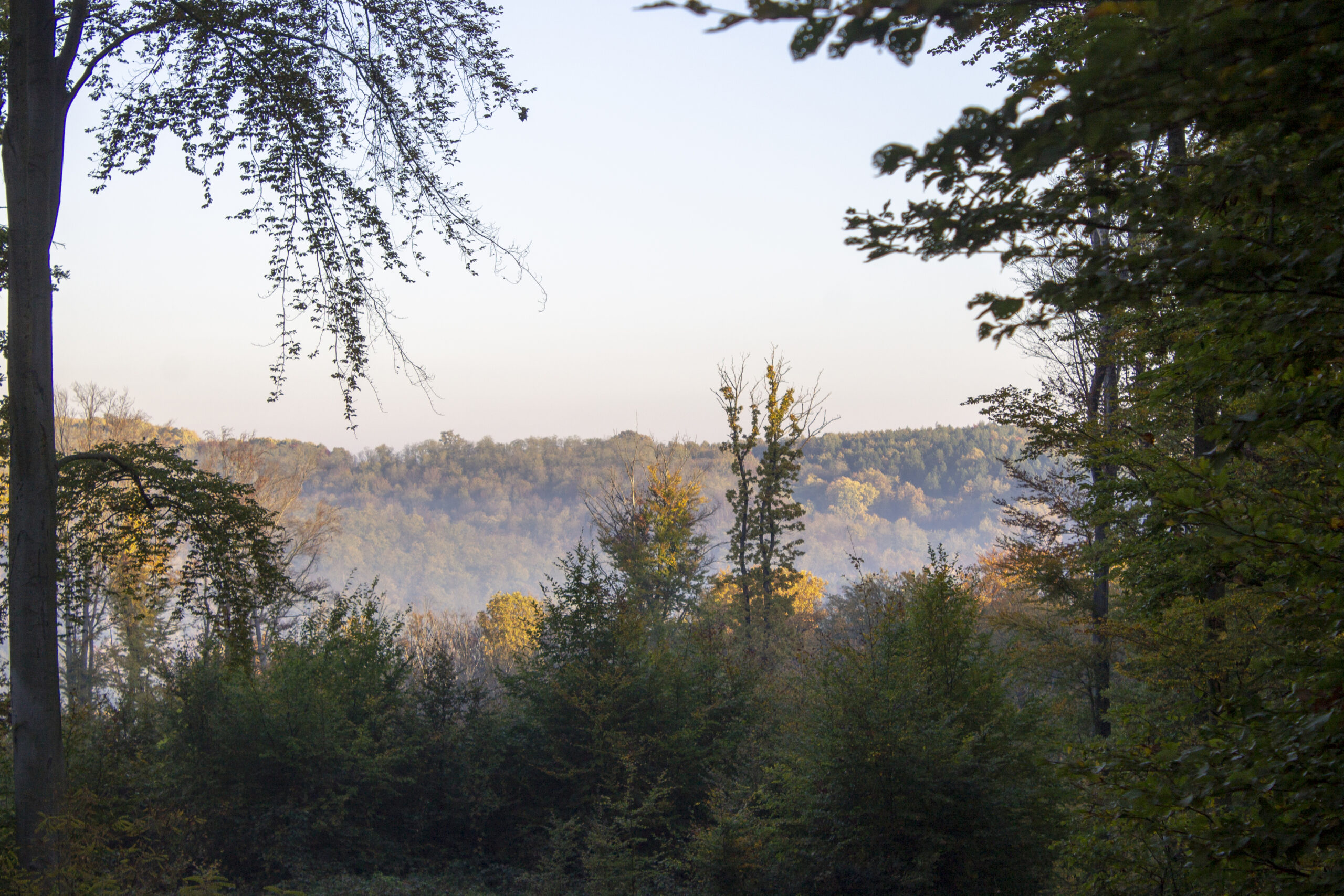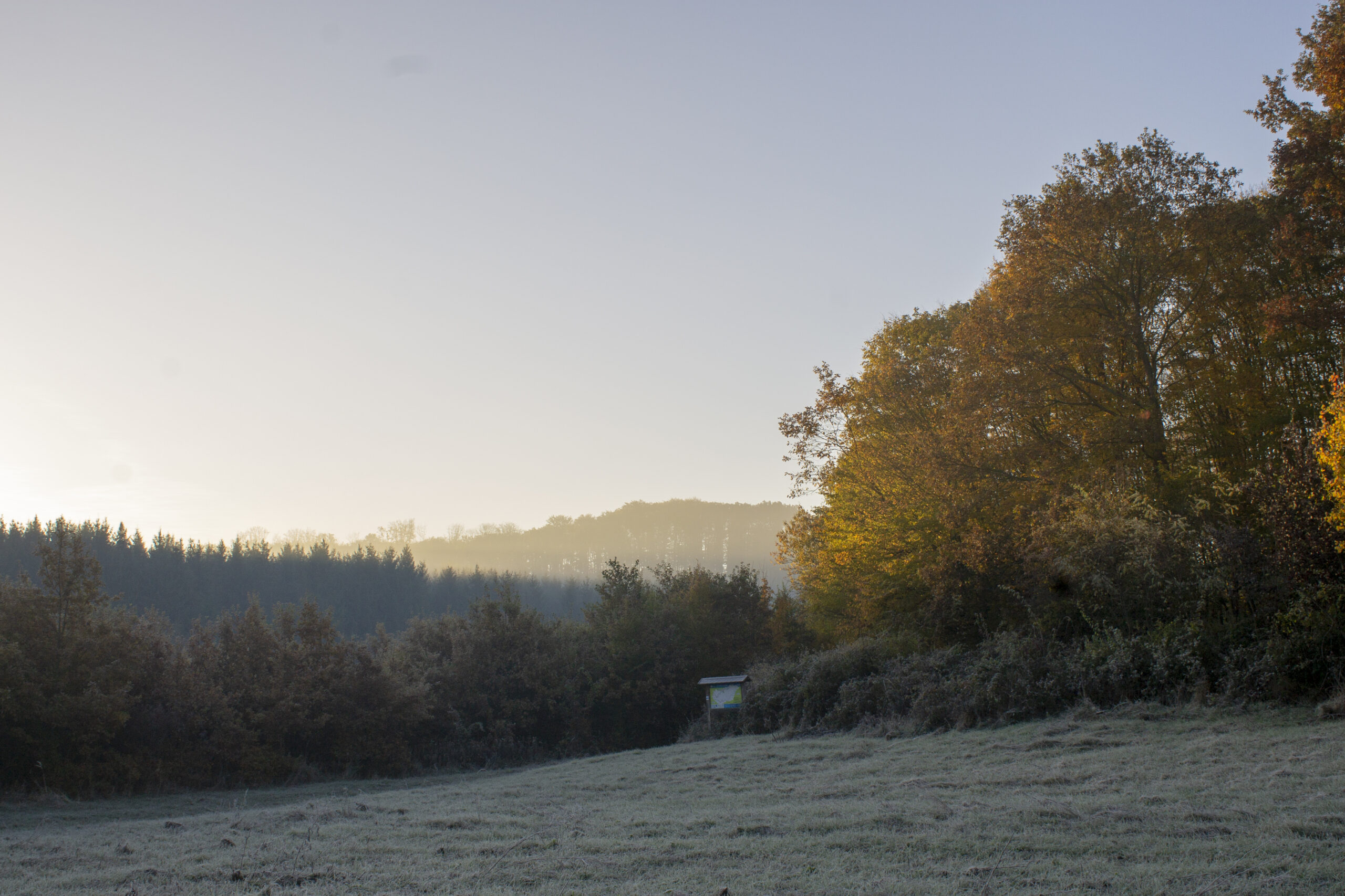 A bokrokon átérve egy kis domboldalra értünk, amit teljesen befehérített a dér, felette a hegylábakon vad-őszi színekben pompázó fák koronáját simogatta a reggeli napsütés. A gomolygó köd (vagy füst, ki tudja) nagyon hangulatos képet tárt elénk. Buzgón fotóztunk, majd szép lassan megkezdtük az első kaptatót aznap. Széles kocsinyomon halad errefelé a túra, két oldalt gyönyörű erdővel néhol kis kilátással a Mecsek irányába. Abaligettől a vasútállomás kicsit távolabb esik, de a kéktúra nem a betonúton halad, hanem a falu feletti dombokon. Időről időre megláttuk az abaligeti templomtornyot, a füstből kikukucskáló háztetőket. Megálltunk a falu felett egy vadászlesnél és újabb gyönyörű fotókat készítettünk. Érdeklődve néztük az előttünk magasodó Mecseket, aznapi útvonalunkat.