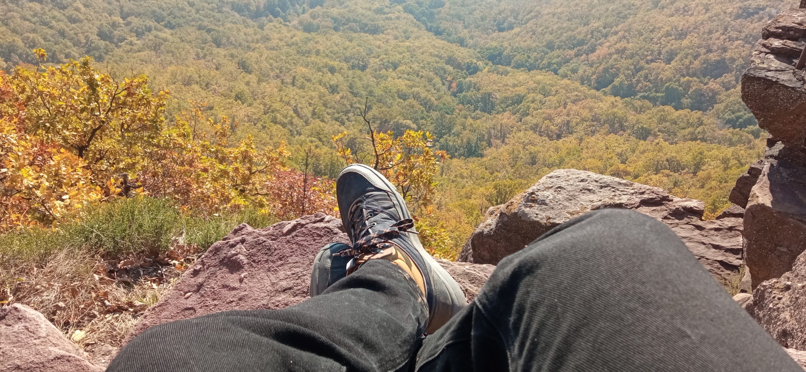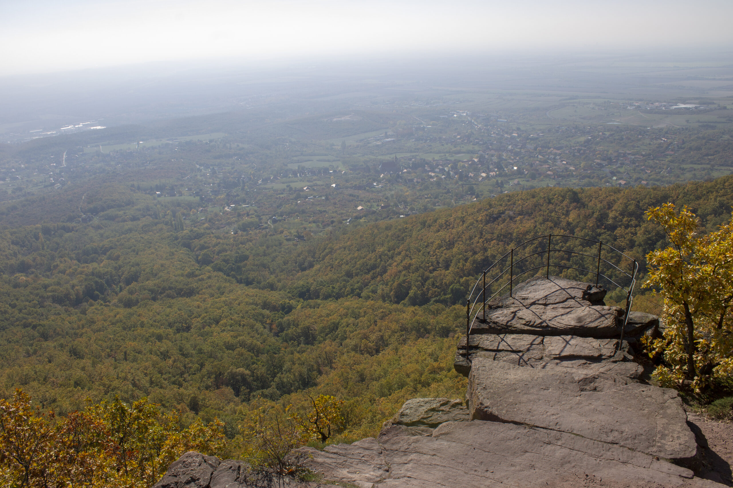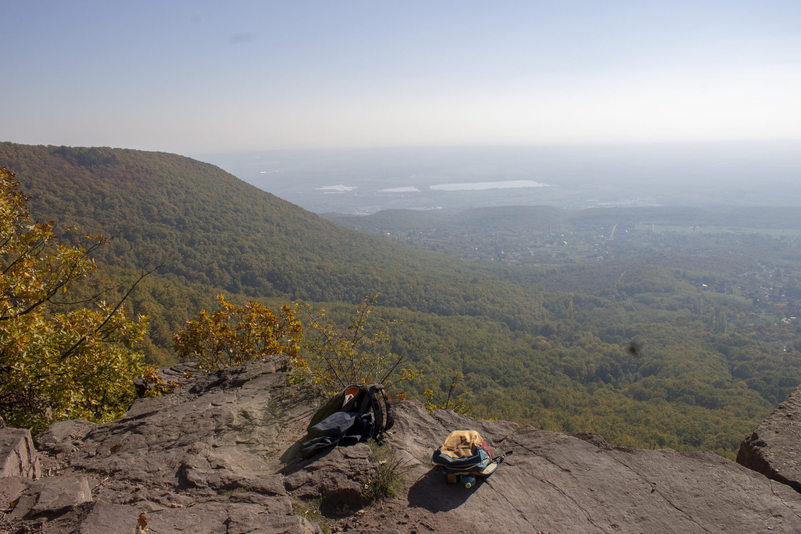 Az volt a tervünk, hogy a Zsongorkőnél fogunk ebédelni gyönyörködve a csodás panorámában. Reméltük, hogy a szép tiszta időben majd messzire ellátunk. Hogy miért hittük azt, hogy szép tiszta idő van meg nem tudnám mondani. Már előző nap sem volt az, a Havihegyről lenézve a város is párában csücsült és ezen a pénteken sem volt ez másként. A Zsongorkőhöz délután értünk el, sokkal korábban, mint azt én számoltam. Jó órát üldögéltünk a meredély szélén, megettük a szendvicseinket, az almát és a jutalomcsokit is. Mindezt vízzel öblítettük le és a tériszonyunk engedte keretek között igyekeztünk fotókat készíteni, pedig nem is lehett túl messzire látni, mert elég párás idő volt. Ezen kissé bosszankodtunk, de legalább van miért viszatérni erre a különleges helyre.