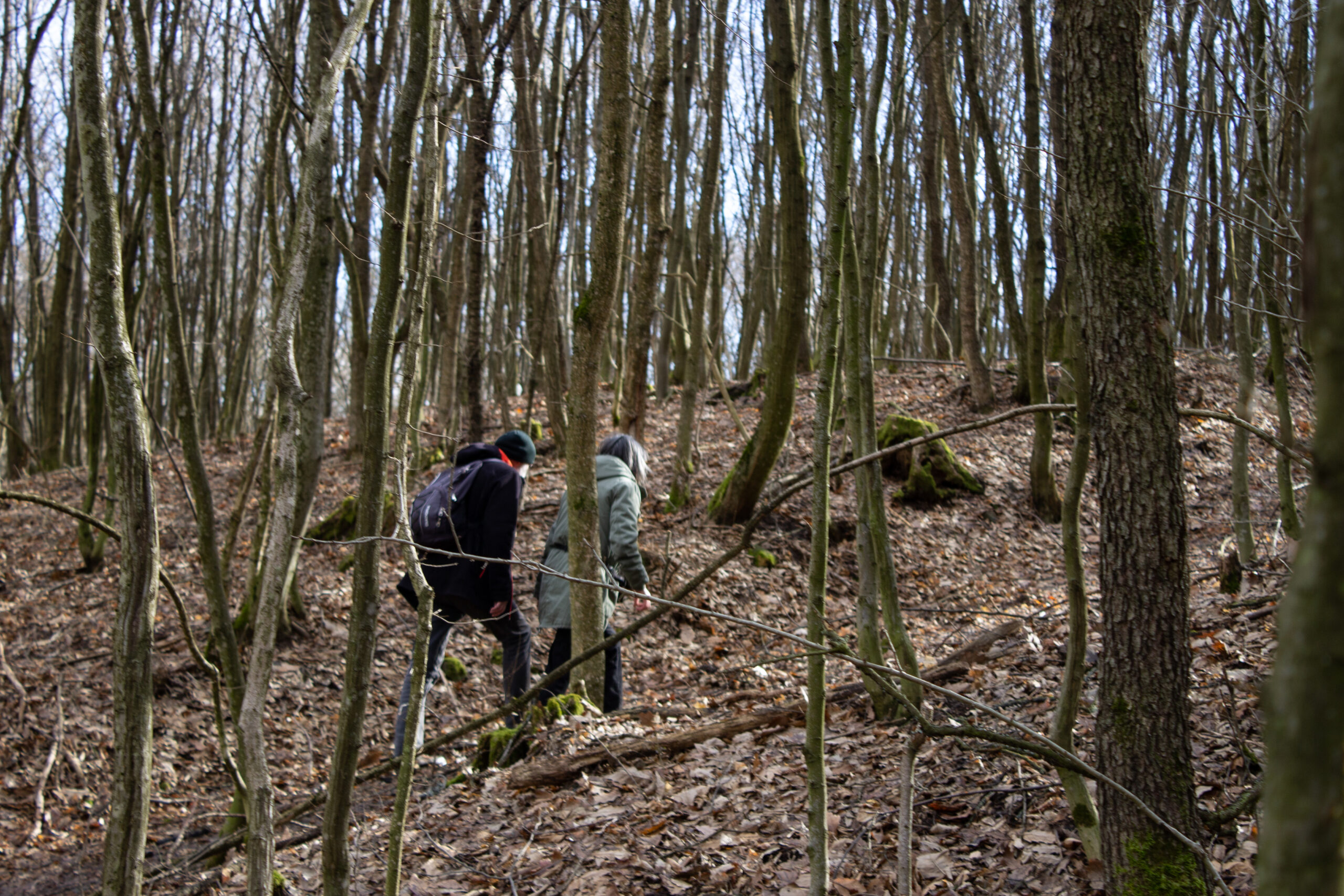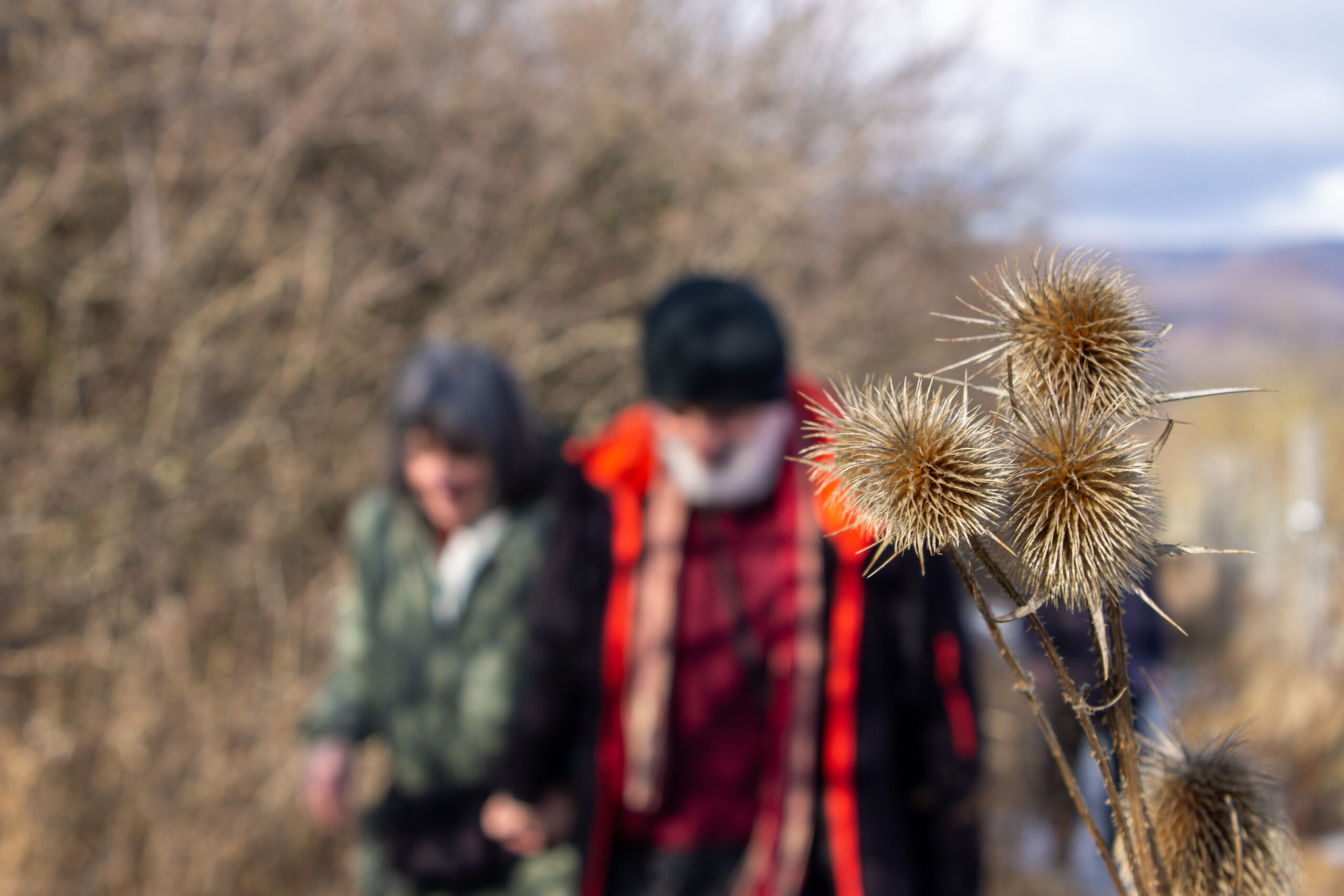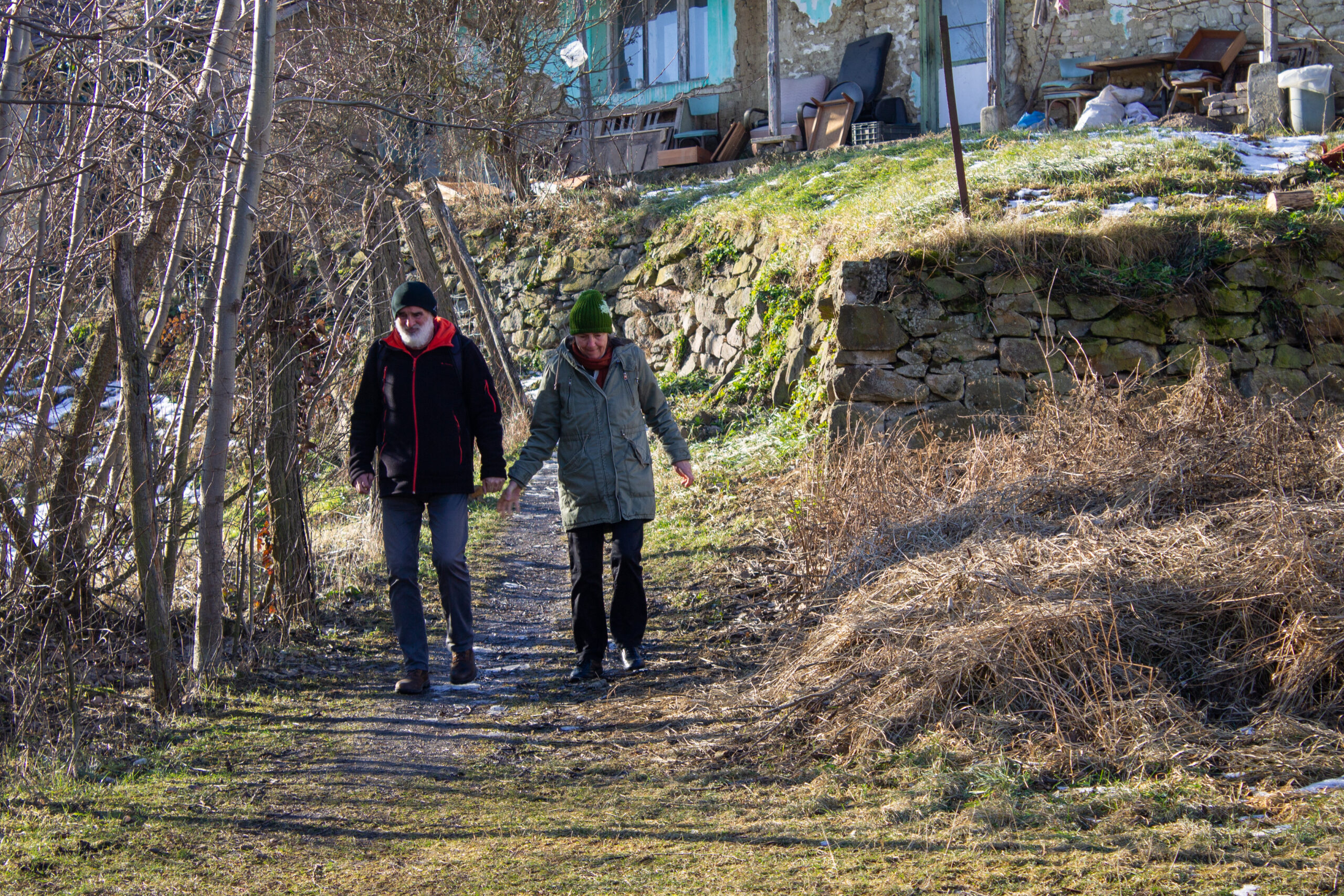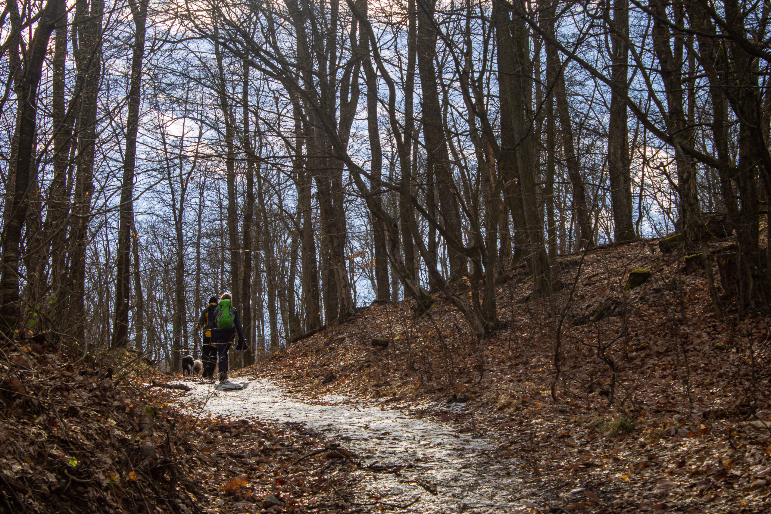 A kabátot és a hátizsákokat igazgatva léptünk ki a kocsmából és vidáman sütött le ránk a nap, ahogy leereszkedtünk újra az állomás irányába. A túrázók egy jó része elindult a Csóványos irányába, a korábbi beszélgetésekből megtudtam, hogy van aki két napot tervezett, Kóspallagon megalszanak és majd Nagymarosnál fejezik be. Nekik már csak a hátukat láttuk, ahogy elindultak az ellenkező irányba, de a mi utunkon is többen megelőztek már minket. Nógrádról egy elég jellegtelen kis ösvény vezet kifelé, de lehet csak a kopár tél végi időszak nem áll jól neki. Vízmosás jellegű, amiben alul jéggé dermedt hó volt, az oldalán meg ragadós sár. Mindezt egyik oldalról egy drótkerítés, másikról szúrós bokrok határolták, ahol meg volt egy kis hely ott embermagas bogáncsok nőttek. Viszont ha hátrafordultál remek kilátás nyílt a falura és a várra, ahogy eltörpültek a távolabbi hegyek mögött.