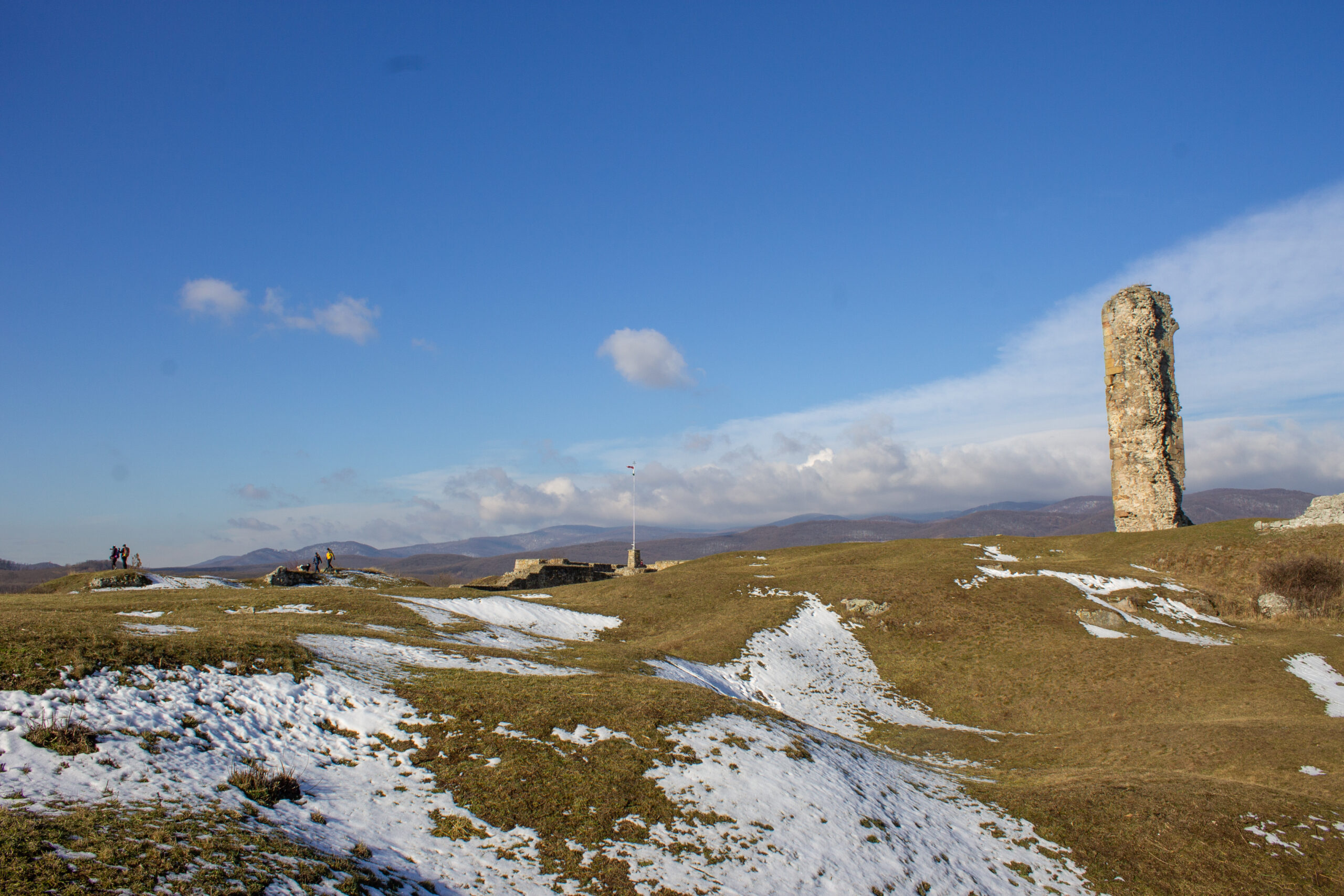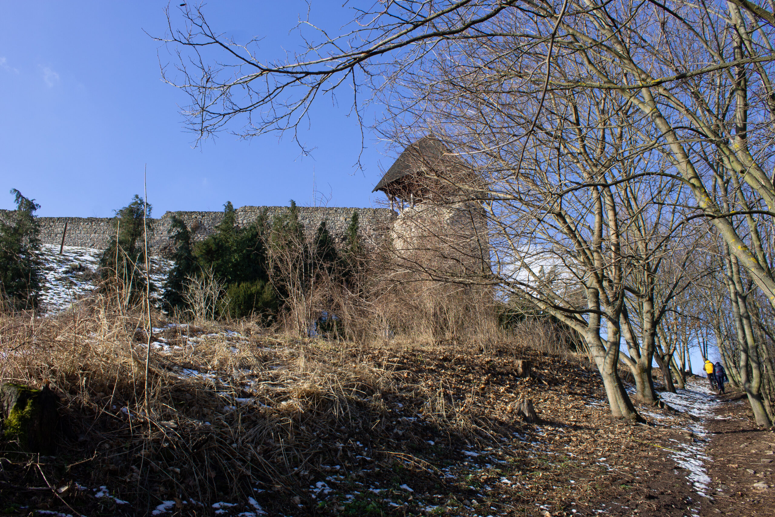 Nógrádon az állomás mellett helyből lehet is egy pecsétet nyomni a kéktúra füzetbe, volt egy kis sor a pecsétnél én is kivártam a soromat és aztán indultunk tovább. Bár az úton ez most kitérő volt, de elsétáltunk a várig, ahol én utoljára nyolc és fél éve voltam (a várból készült a korábbi blogom háttérképe). Szépen, elnyújtott libasorban mentek a kirándulók a vár és a falu irányába. Inkább hűvös volt, mint hideg csak néha erős szél kerekedett. Az általában árnyékos helyeken megmaradt a hó és mostanra összetömörödött, alattomosan csúszós jégbordává változott. Óvatosan csúszkálva jutottunk el a vár parkolójáig, ahol Apuék is fel is adták a küzdelmet. Én nekivágtam a dombra vezető szerpentinnek, ami szerencsére csak lentről tűnt egybefüggő jégpáncélnak. A kövekkel kirakott úton lépésnyi távolságra mindig találtál egy-egy megszáradt, a jég alól kilógó felületet ahova léphettél. Nem volt egy nagy öröm és nagyon oda kellett figyelni mit csinálsz és hol veted meg a lábad, de fel lehetett menni azért. Ahogy az út befordult a domb napos oldalára helyből nem volt probléma már a jégtakaró! Helyette csúszós, marasztaló sár várt. Sűrű káromkodások közben értem fel az egykori várkapuig, többedmagammal.