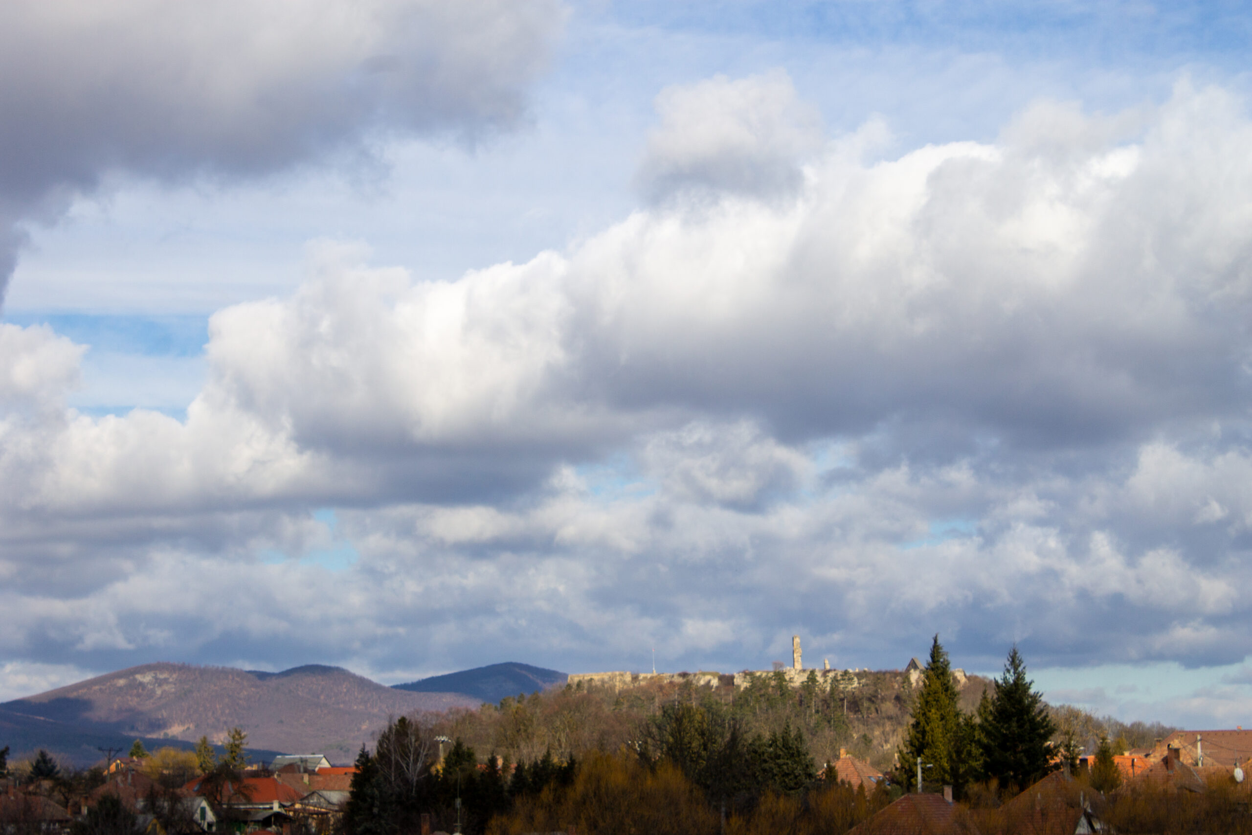 Megérte felmenni, mert nagyon tiszta idő volt, a nap erősen sütött, de nehéz volt eldönteni, hogy most egy kora-tavaszi vagy késő-téli napunk van inkább. Dél felé csak pár felhő és a falu, északra meg hirtelen magasodtak fel a hegyek. A csúcsaikban elakadtak a nagy kékes-szürke felhők, mesebeli látványt nyújtottak. Szívesen maradtam volna fent hosszabb ideig, de végül eltettem a fényképezőgépet és nekiláttam a csúszkálós ereszkedésnek, mert nem akartam nagyon megváratni a társaságomat.