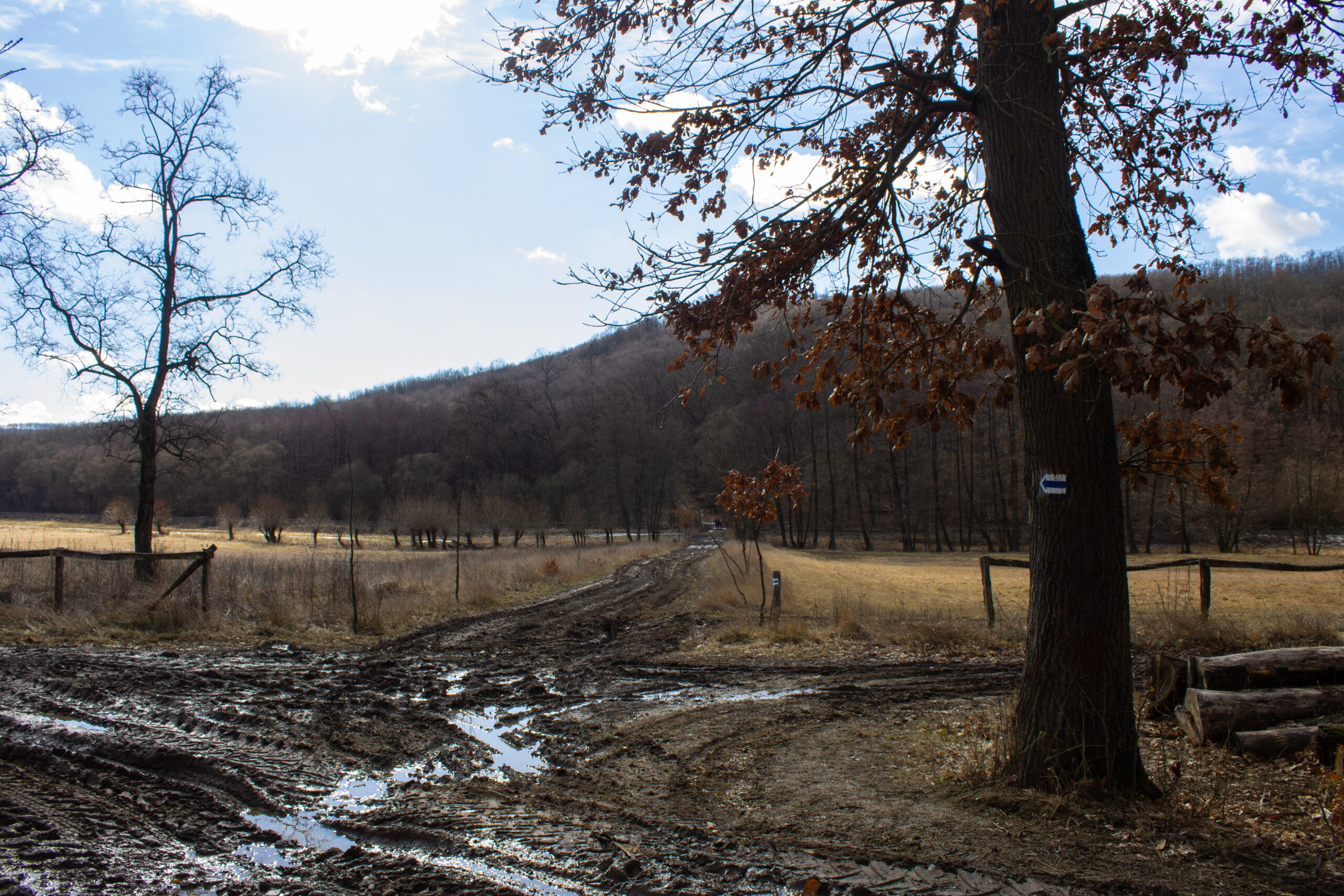 Pechünk volt az olvadással. A meredekebb részeken már csak alig volt sár, de ott is akadtak alattomos-csúszós foltok, viszont a vízszinthez közelítő részeken hamar bokáig lehetett süllyedni, ha nem vigyáztál. Így aztán lassan, óvatosan haladtunk, de nemsokára elértük a vasúti síneket és átlábaltunk a pocsolyás részen. Hát igen, otthonról úgy indultam, hogy novemberben szépen kimosva eltett túrabakancsom csillogott-villogott, most meg csurom egy sár volt az egész. De nem ázott be és ez a lényeg!