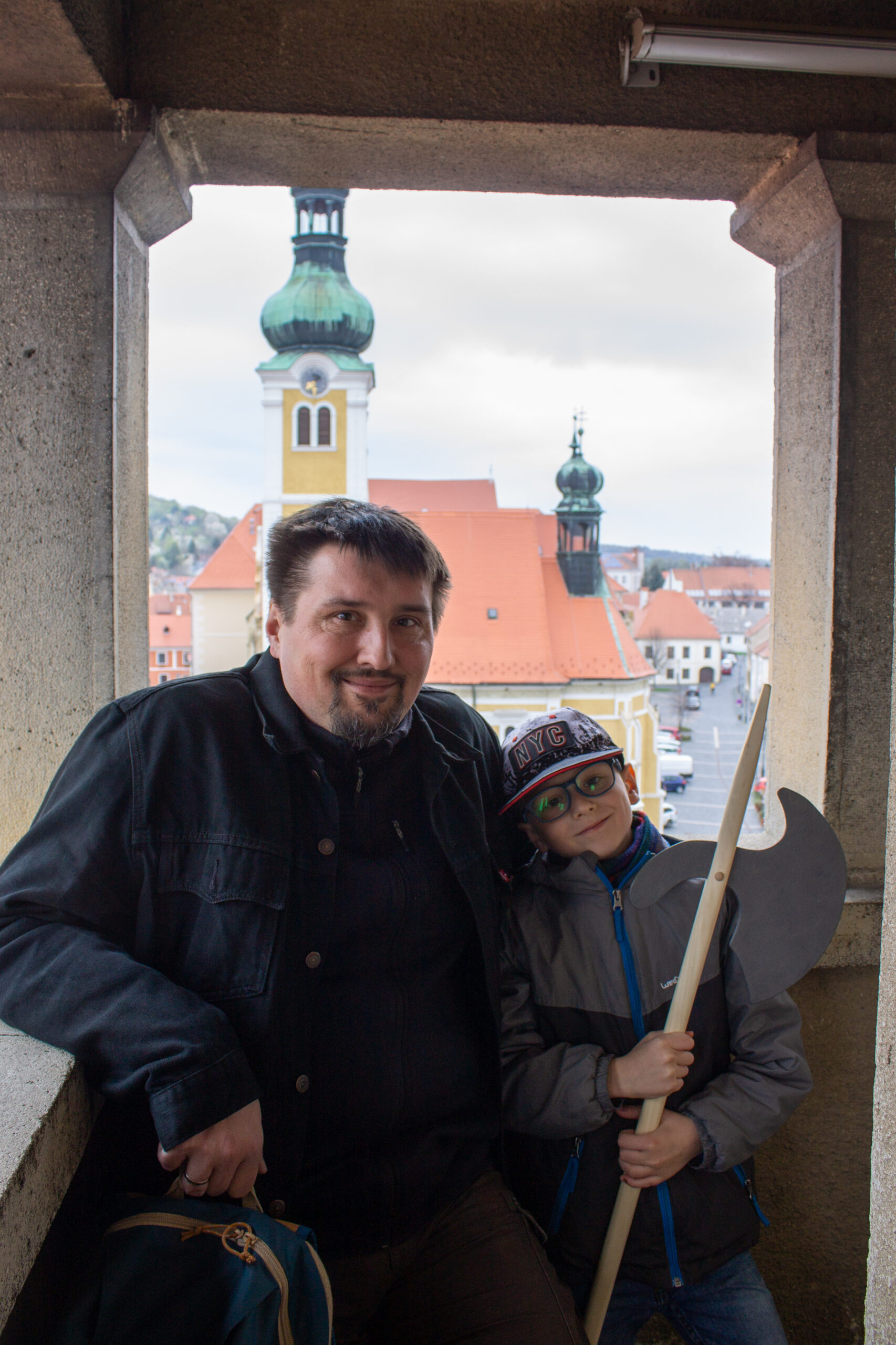 Zsófiék úgy tervezték, hogy délután indulnak vissza Budapestre, így előttünk állt az egész délelőtt a helytörténeti és a vármúzeum bejárására, lezárásként pedig egy búcsúebédet terveztünk. A tejívóból a Hősök tornyához igyekeztünk, itt van a helytörténeti kiállítás. Nagyon érdekes volt, főleg a céh kódexek lapjait böngészgettük sokáig, a gyerekeket teljesen fellelkesítette az amit Terry Pratchet a helyesírás feltalálása előtti időknek szokott nevezni. Nekem a legjobban mégis a kilátás tetszett. A torony tetejéről szép képeket is készítettünk a városról, de nagyon hangulatos volt a régi ház ablakain kikukucskálni a fő térre, az utcákra. Sajnos az időjárás csak romlott, de azért készült pár fotó emlékbe.